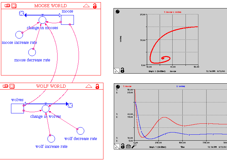 Suppose the predator species is wolves and the prey species is moose as on Isle Royale in Lake Superior. Click once on the picture to see an enlarged, more readable version. Notice that the populations cycle, with the predator peaking right after the prey. Competition in the Prey (1930s): The primary objection to the LV Model was that the prey (x) would increase without bound if the predators died out. What if competition among the prey is also incorporated?
