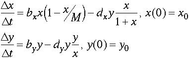 Click once on the picture to see an enlarged, more readable version. Notice that the populations cycle, with the predator peaking right after the prey, but the cycles die off even more quickly, approaching a stable population. May (1960s): The prey death term implies that for a given y, the number of prey eaten is proportional to the number of prey present. This implies that predators are never not hungry. He fixed this by adding a piece to the prey death that would control this term.