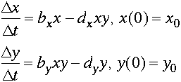 Now we want to look at two species that interact: x is the prey and y is the predator. Now we have two equations instead of one, each with increase rate and decrease rate terms.