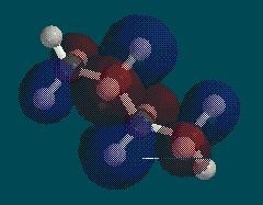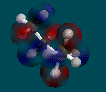 The upper graphic is a MacSpartan representation of the anti-butane isomer with the HOMOs. The lower graphic depicts a cis-butene isomer, with the dihedral angle constrained at 0 degrees. The blue areas represent an electron rich orbital, while the red areas represent an electron poor orbital. In the upper, stable isomer, the orbitals that surround the methyl groups are extremely removed from each other. The orbitals are staggered throughout the entire molecule, resulting in low conflict between the like-orbitals. In the lower isomer, the methyl groups are in very close proximity to each other, and, by looking at the graph above, it can be seen that this isomer is one of the most unstable possible.