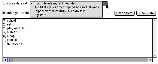 - Pre-made data sets may be selected from a choice menu. To alter the data, the user may change the data displayed in the data box below the choice menu, and hit the "Graph Data" button. To clear all data, the user may hit the "Clear Data" button. The choice menu, data box with data, and the two buttons are shown below.