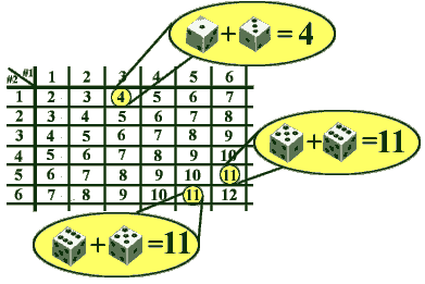 Let us compute P(A) and P(B) (the probabilities of Events A and B) using the most straightforward method: counting chances. That is, we can count the favorable situations and find the total number of outcomes. The following table lists the outcomes and sums of the dice in case of each outcome: