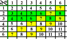 Mentor: In the Three Boxes game, each box contains two chips: the first has two red chips, the second has two green chips, and the third has one red and one green chip. We do not know which box contains which chips. We take one chip out of a box without looking inside, and when we look at it we find it is green. What are the chances, theoretically speaking, that the second one is also green? Student 1: There is only one box out of three that has two green chips, so the probability should be 1/3. Student 2: We know that the first chip was green. There are only two boxes holding green chips. One of them has two green chips, so the probability is 1/2. Student 1: But wait, we have played the game on the computer many times. The experimental probability was getting closer and closer to 2/3. Mentor: We have three competing answers! It means that the problem is not very simple. Let us look at several easier problems and then return to The Three Boxes. Mentor: Let us look at a dice game with two six-sided dice. The sum of the dice decides who wins (see Multi-dice fun for a detailed discussion of the game, or the activity page (Game 4) to play a related game). What is the probability that the sum of the numbers on the dice is seven? Student: There are six ways of getting the sum of seven: 1, 6 2, 5 3, 4 4, 3 5, 2 6, 1 There are 36 possible ways two dice can roll, so the probability of the sum of seven is 6 out of 36, or 1/6. Mentor: Let us call:
