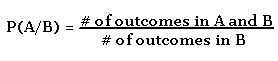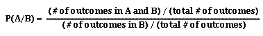 Student 2: It looks much like your formula for conditional probability, only we have the numbers of outcomes instead of probabilities. Can we turn them into probabilities somehow? Mentor: How do you get the probability of an event if you know the number of outcomes in the event? Student: I figure out the total number of all possible outcomes and divide by it. Mentor: You know, it does not change the fraction if you divide both the numerator and the denominator by the same number... Student: I know! If we divide both the numerator and the denominator of the outcome formula by the total number of outcomes, we will get the probability formula: