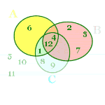 Mentor: Let us consider one more game as an example. In this game, four players share a twelve-sided die. Player A (Anton) wins if the die shows 1, 4, 6, or 12. Player B (Boris) wins if the die shows 2, 3, 4, 7 or 12. Player C (Chris) wins if the die shows 1, 4, 8, 9, or 12. Player D (Dorothy) wins if none of the other players win. I will describe several events to demonstrate how convenient the diagrams can be. First try to find the probabilities without looking at the diagrams: this way you will see which of them are hard to find without the diagrams. Find the probabilities of the events listed in the table. The corresponding diagrams and the answers are also in the table. Instead of writing: "The probability of Event A is .33" we can write simply P(A)=.33 The answers follow from counting the outcomes, out of twelve total.