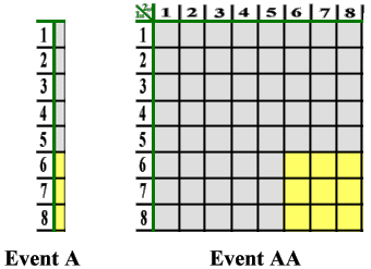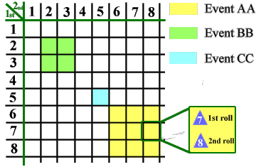 Event A={6, 7, or 8 shows when we roll the die} Event B={2 or 3 shows when we roll the die} Event C={5 shows when we roll the die} Event AA={we roll the die twice, and get 6, 7, or 8 both times} Event BB={we roll the die twice, and get 2 or 3 both times} Event CC={we roll the die twice, and get 5 both times} Mentor: What is the probability of each of these events? Student 1: Event A happens in three out of eight chances, so P(A)=3/8=.375 or 37.5%. Student 2: P(B)=2/8=1/4=.25 or 25% Student 3: P(C)=1/8=.125 or 12.5% Student 1: What about the double-letter events? We will use a table:
