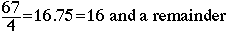 How do I get the remainder from this? I don't say 0.75, do I? Mentor: No, but you have all the information you need. The 16.75 lets you know that 4 goes into 67 sixteen times, so now to find the remainder, just take.