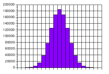 Student: When I was looking at the normal distribution and the skewed distribution activities, I noticed that the histograms never looked much like the curves. When I made the bin size very big, the heights looked good but it looked like a row of large blocks. When I made the bin size small, the heights were very blocky because they only had a few values. Mentor: Very good. Student: So what do the curves really mean? Are they just guesses? Mentor: In a way it is as if you took an average of all the graphs you made, with all the different bin sizes. But there is a better mathematical way to look at it. Do you remember experimental and theoretical probability? Student: Yes. Theoretical probability is when you add up the favorable outcomes and divide them by the total outcomes. Experimental probability is when you try an experiment a lot of times, and divide the successes by the trials. Mentor: And when you did something a lot of times, those two numbers got very close to each other, didn't they? Student: Yes. Mentor: And if you did it an infinite number of times, which is to say if you did it forever, you'd actually get back the theoretical probability. You'll learn more about infinity when you study fractals, but for now what's important about it is that big numbers that are not infinite act more and more like infinity as they get closer to it. So we can believe that the theoretical probability of something is the same as if you ran the experiment infinite times. Student: So if I flipped a coin, and kept track of the number of heads, forever, I'd really get half heads. Mentor: Yes. And if you flipped two coins at a time, and kept track of how many heads you got each time, you might get a histogram like this: ![]() Student: That looks like some of the histograms I had when I set the bin size very large. Mentor: Yes. It wouldn't make sense to change the bin size on that graph, but what if we flipped more than two coins? Then there would be more possible values. If we flipped twenty coins each time, the theoretical graph looks like this: