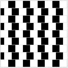 Student: I see rows of crooked lines with a distorted checkerboard pattern in them. Mentor: Are you sure the lines are crooked? Student: Yes! They look wider at one end than the other. Mentor: Hold a ruler or other straight edge along the horizontal lines in the image and tell me what you observe. Student: (holding a ruler to the image) It doesn't seem possible, but the lines actually are straight! Why do they appear to be crooked? Mentor: It is an example of an optical illusion: something that appears to our eyes to have an effect that it does not really have. The placement of the alternating dark and light squares "tricks" our eyes into seeing the horizontal lines as crooked. Student: Oh, that reminds me of another similar "trick" my brother showed me. I will draw two lines, and you tell me which one is longer: