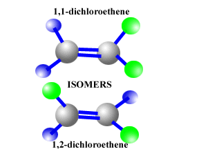Isomers are two or more molecules that have the same molecular formula but with their individual atoms in a different arrangement. The word "isomer" comes from the Greek meaning "equal" parts. You might find it useful to think of isomers as different molecules made from the same kit or parts or atoms but with those parts attached in different ways. Some environmentally important alkenes have chlorine substituted for hydrogens in the molecule. When a chlorine atom is substitute it's location is also signaled by the carbon number to which it is attached in the name. For example, 1,1-chloroethene is distinguished from its isomer, 1,2-dichloroethene.