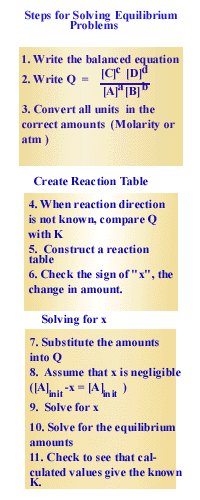 There are, of course, many ways to solve equilibrium problems. In this section we will focus on a few useful approaches. The key to solving these problems is to recognize that Q = K at equilibrium; that the reactant concentration is changed by some amount, say "x", multiplied by the correct coefficient for that reactant from the balanced equation. Product concentration changes in the opposite direction by the same factor, "x" multiplied by the coefficient for that product from the balanced equation. Many chemists find it convenient to construct a reaction table that shows