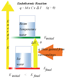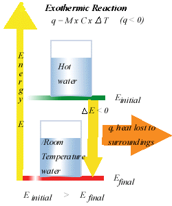 Energy and Thermochemical EquationsThe first law of thermodynamics states that: energy cannot be created or destroyed. Energy can only change form. Chemically, that usually means energy is converted to work, energy in the form of heat moves from one place to another, or energy is stored up in the constituent chemicals. Heat is defined as that energy that is transferred as a result of a temperature difference between a system and its surroundings. Mathematically, we can look at the change in energy of a system as a function of both heat and work: where DE is the change in internal energy of a system, q is the heat flowing into the system, and w is the work being done on the system. If q is positive, we say that the reaction is endothermic, that is, heat flows into the reaction from the outside surroundings. If q is negative, then the reaction is exothermic, that is, heat is given off to the external surroundings.