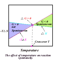 The relationship between free energy, enthalpy, temperature and spontaneity is clear when considering the changes in state of water. Solid water, or ice, is a very ordered, crystalline material. Given the 2nd Law of Thermodynamics, you might conclude that ice will spontaneously change state to water since the entropy of liquid water is much lower than ice. In fact this only occurs when the temperature is greater than 0oC. At lower temperatures the TDS term is smaller than DH which means DG is positive. A positive DG means the reaction is not spontaneous. An Enthalpy and Gibbs Free Energy Calculator is provided to give you an opportunity to experiment with these relationships.
