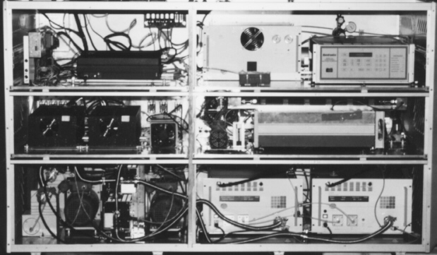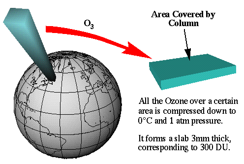 ![]() Measurements of ozone in the stratosphere can be taken by balloon, satellites, or aircraft. The equipment can be like the TOMS (Total Ozone Mapping Spectrometer), or NASA's ER-2 aircraft, or even devices installed on commericial flyers. For example, the project NOXAR put equipment on SwissAir. The data found can be expressed in partial pressure (Pa), volume mixing ratios (ppm), density (molecules per cubic centimeter), or column depth. Column depth is measured in Dobson Units (DU). That is the integral of the ozone density over the height of the atmosphere. It is the physical depth that all the ozone would occupy if it were an ideal gas at STP. 1 DU is equal to 10(-3) atm-cm or 0.001 cm thickness at STP.