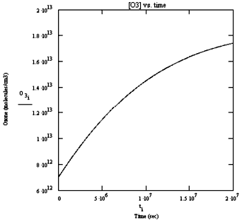 Chapman Cycle ModelThe actual computation of the time dependant results of the Chapman Cycle requires the use of a "stiff" equation solver. This means that the evolution of at least one type of molecule in the equations depends very strongly on small changes in another molecular concentration. The model used on page 1 solves for an equilibrium solution using a Newton-Rhapson method. This method, while both quick and accurate, does not tell the user how long it takes to establish equilibrium, nor does it give information on the stability of the solution. You might try using an initial guess for the O radical concentration which is greater than the molecular oxygen concentration. Notice that this gives the result of a completely atomic gas, an unstable equilibrium. The time dependant results of a solution of the rate equations can be seen below.