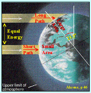 For example, the table below shows the results of a calculation for Durham, NC (35.98N, 78.91W) on November 28, 2000 at 3 PM Eastern Standard Time. The amount of solar radiation reported is 1405 W (watts, a unit of power) per square mile. This is roughly 3% more than the solar constant (1367 W/square meters). The solar constant is a global average of solar radiation, including the dark parts of the Earth, so the fact that the radiation is slightly more than the solar constant here during daytime suggests we're in late autumn, afternoon conditions with less sunlight than some parts of the daylit Earth are receiving.