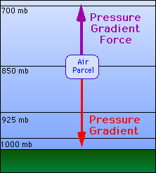 Vertical Pressure GradientA pressure gradient is a change in pressure over a distance, directed toward increasing values. We must remember that pressure changes dramatically with height, forming a pressure gradient directed toward higher values (down). This in turn produces a very strong pressure gradient force directed upward.This pressure gradient is about four orders of magnitude larger in magnitude than the horizontal PGF. However, it is also balanced by a strong force -- gravity. Confused? Have a question? If so, check out the Frequently Asked Questions (FAQ) page or send mail to the OS411 tutor (os411tutor@shodor.org) with your question! Report technical/content problems here |