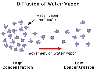 Diffusion ProcessThe continued growth of a cloud droplet, once condensation has started, is initially governed by the diffusion of the water vapor molecules toward the droplet. Diffusion is the process of molecules moving from regions of higher concentrations to regions of lower concentrations. At the surface of a droplet, water vapor is simultaneously condensing and evaporating. When the concentration of water vapor molecules is higher some distance from the droplet than it is at the droplet surface, the water vapor in the air diffuses toward the droplet, condenses onto the droplet, and the net effect is droplet growth. Two phenomena which influence the growth that occurs by diffusion are the curvature effect and the solution effect.