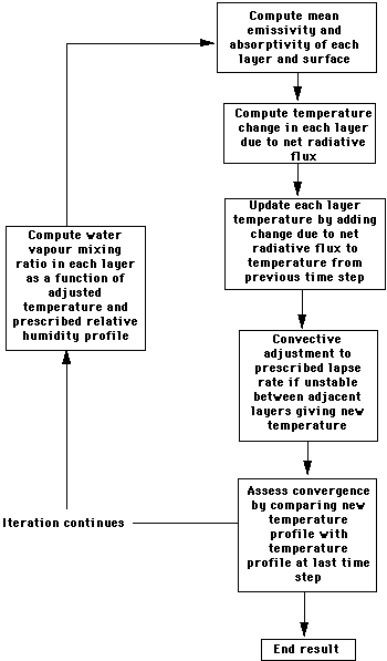 Obviously, at the surface there is no transmission, only reflection and absorbtion. Once the temperature change has been calculated, a simple additive step updates the temperature in each layer by adding the change in temperature to the temperature in the previous timestep. It is helpful to remember that RC models are iterative in nature; that is, they repeat through a time-specific cycle until some stopping condition is met. At this point the convective portion of the model comes into play. RC modelers state that the layer is "convectively unstable" if the lapse rate for that layer is greater than some predetermined critical lapse rate. Lapse rate is defined as: