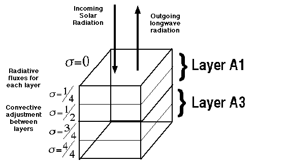 ![]() In this diagram, we show two layers, A1 and A3. In most RC models, the net radiative cooling (a balance of shortwave and longwave radiation) is often shown at the midpoints of two layers, in this case between layers 1/4 and 3/4. The mechanics of how these models are built is perhaps shown in the graphic below: