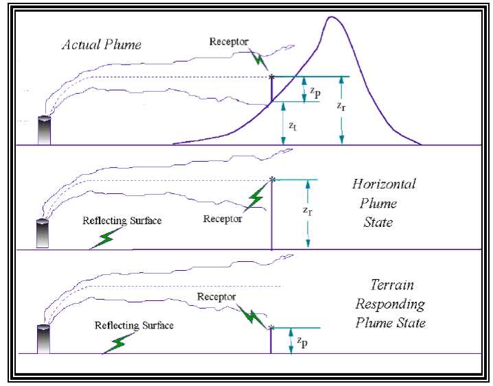 | AERMOD uses a two-layer structure found in through theoretical and experimental work: in a stable atmosphere, the lower layer remains horizontal while the upper layer rises over any existing terrain, divided by the terrain height. In a neutral or unstable atmosphere, the lower layer disappears and the plume rises up and over the terrain.