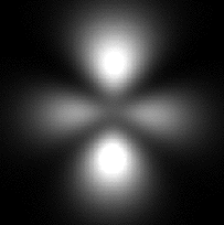 When you open Atom in a Box, it automatically brings up a 3d orbital. You can identify the orbital by its shape as well as the label in the upper line of the dialog box. The orbital is identified by quantum numbers n, l, and m. A "name" is given next to the values of these quantum numbers. See Slide 25 for a description of quantum numbers.
