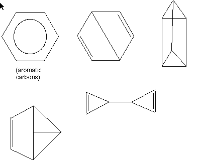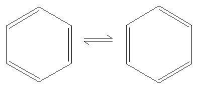 Aromaticity occurs when carbon forms bonds which are not exactly single or double, but rather are of intermediate length. The most common example of this is in benzene rings, C6H6. The six carbons are in a hexagonal arrangement, all in the same plane. There are two possible ways to draw this structure so that all of the valences are filled, using a combination of single and double bonds. These are shown below. Hydrogens are left off for convenience, and each of the corners is a carbon atom. Single lines are single bonds, double lines are double bonds. Because these two structures are forms of the same molecule, they are called "resonance structures".