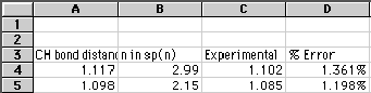 In the output , record the calculated equilibrium carbon-hydrogen bond lengths in a spreadsheet table, along with the calculated hybridizations of carbon. Calculate percent error with experimental values, shown below: