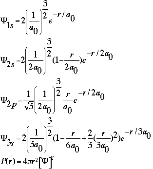 The wavefunction is the basic algorithm that we will use for this, but it does not directly represent probability. As you see in the algorithm, the wavefunction squared times the radius is an actual probability distribution. The wavefunction depends on radius, measured in picometers (pm) and a constant, the Bohr radius. The Bohr radius is written as a0 and is the distance of the nucleus to the first orbit in the Bohr atom. Its value is 52.9pm. Below are the algorithms needed.