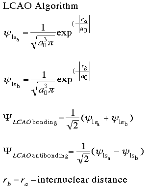 LCAO stands for Linear Combination of Atomic Orbitals; feel free to review the slide on AOs and MOs. LCAO theory breaks molecular (multi-atom) orbitals into a sum of atomic (multi-electron) orbitals. In this case study, you will investigate how the bonding and antibonding orbitals are constructed using a spreadsheet to implement the LCAO algorithm. This will be done with an H2 molecule, so it is the simplest molecule possible, with only two electrons. We are interested only in the ground state of this molecule, so the wavefunction only has to represent two 1s orbitals combining. The algorithm is shown below.