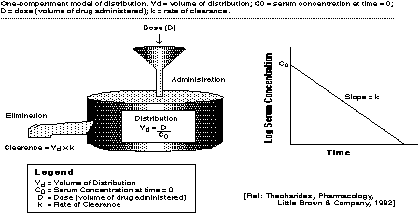 Both volume of distribution and clearance can be related to each other through the term of half-life. Half-life is that period of time when one-half of the substance has been removed through some mechanism. Mathematically, pharmacokinetic half-life can be defined as:
