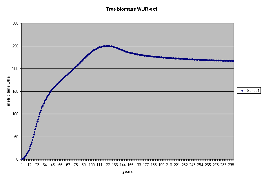 The biomass increases rapidly for the first 35 years as the forest starts to grow. Then the biomass increases at a moderate rate until year 100. Next the amount of Biomass levels off and starts to decline about year 120. There is a gradual decline in the biomass for the remainder of the run. | ||