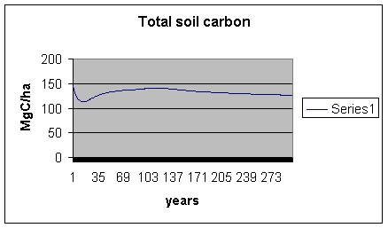 Explain why the soils carbon dips then increases then decreases again. The carbon is constantly decomposing and changing back into CO2. In the first years the trees are small and produce very few needles and debris. The carbon in the soil is disappearing faster than it is being replaced. As the trees mature they produce more debris and the amount of carbon in the soil increases. When the trees reach maturity their production of needles and debris levels off and starts to decline slightly with increasing age. The soil C level mirrors this gradual decline. | ||