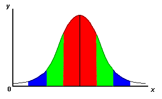 One standard deviation (sometimes expressed as "one sigma") away from the mean in either direction on the horizontal axis (the red area on the above graph) accounts for somewhere around 68 percent of the data points. Two standard deviations, or two sigmas, away from the mean (the red and green areas) account for roughly 95 percent of the data points. Three (3) standard deviations (the red, green and blue areas) account for about 99 percent of the data points.